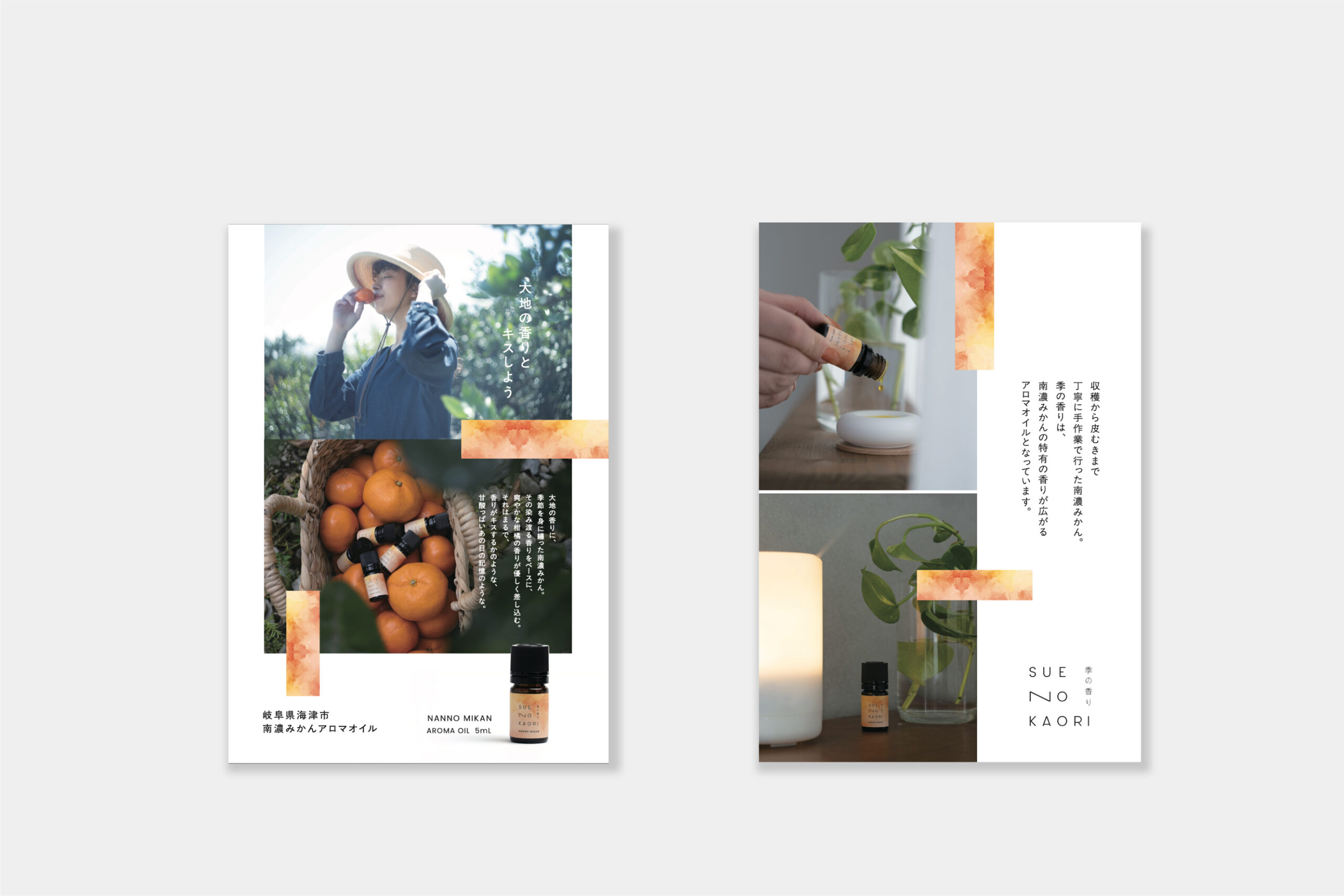 海津市の名産、南濃みかんの廃棄物を使ったアップサイクルなプロジェクト。南濃みかんの皮を使ったアロマオイルの制作のブランディングを担当しました。 コンセプト開発、ネーミング開発、コピー、パッケージ、キービジュアルの作成などと言ったあらゆるクリエイティブの制作携わる事ができ、クライアントや僕たちの想いもたくさん詰まっています。 コンセプトにもある、"大地の香りにキス"するかのような甘酸っぱい香りは、南濃みかん特有の香りに仕上がりました。