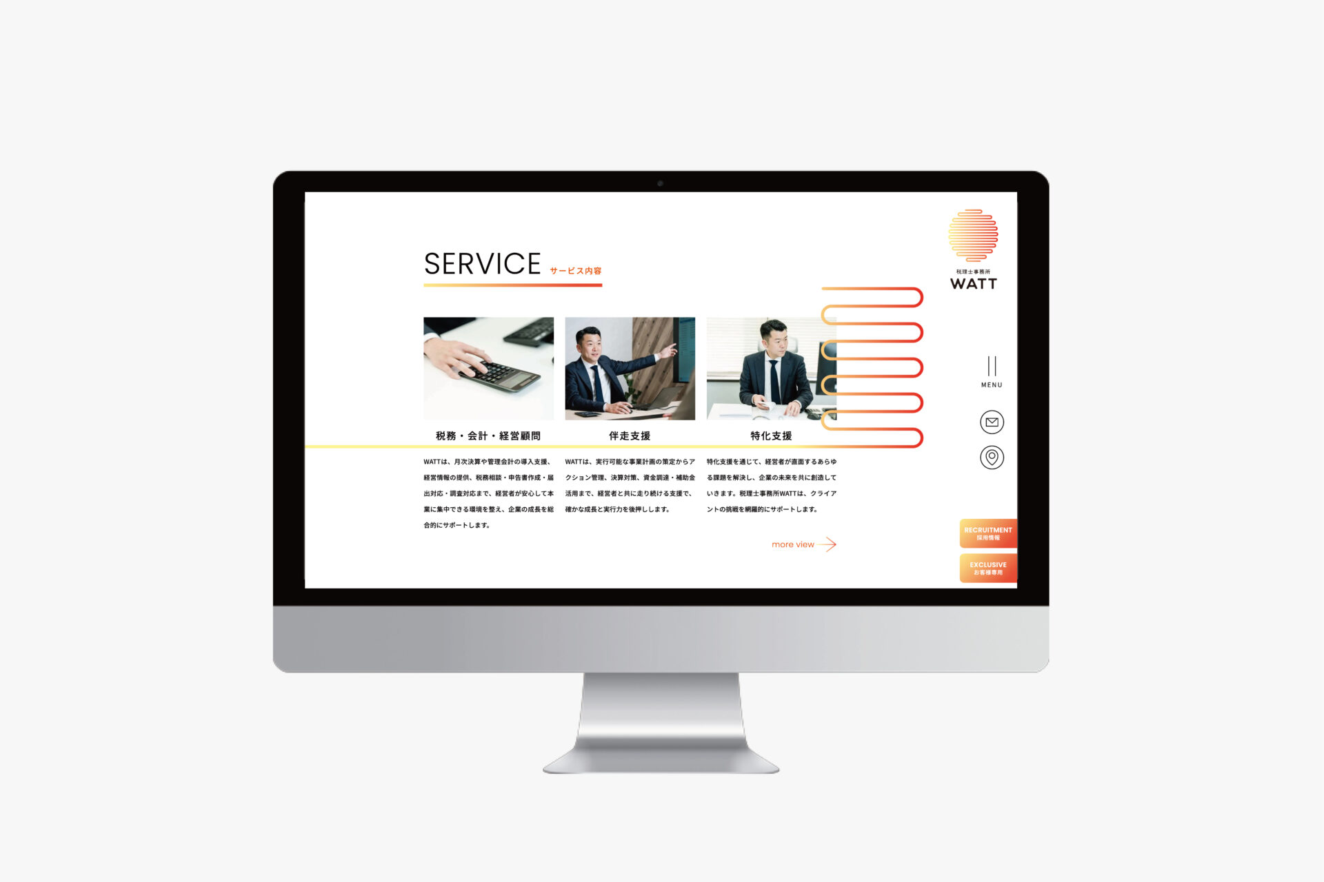 岐阜市に開業した税理事務所WATTのWEBサイトでは、キーカラーのオレンジを基調としたデザイン制作を行いました。 また、税理士業の仕事内容が明確化できるように、サービスページを事細かく制作し、SEO対策にも対応しています。